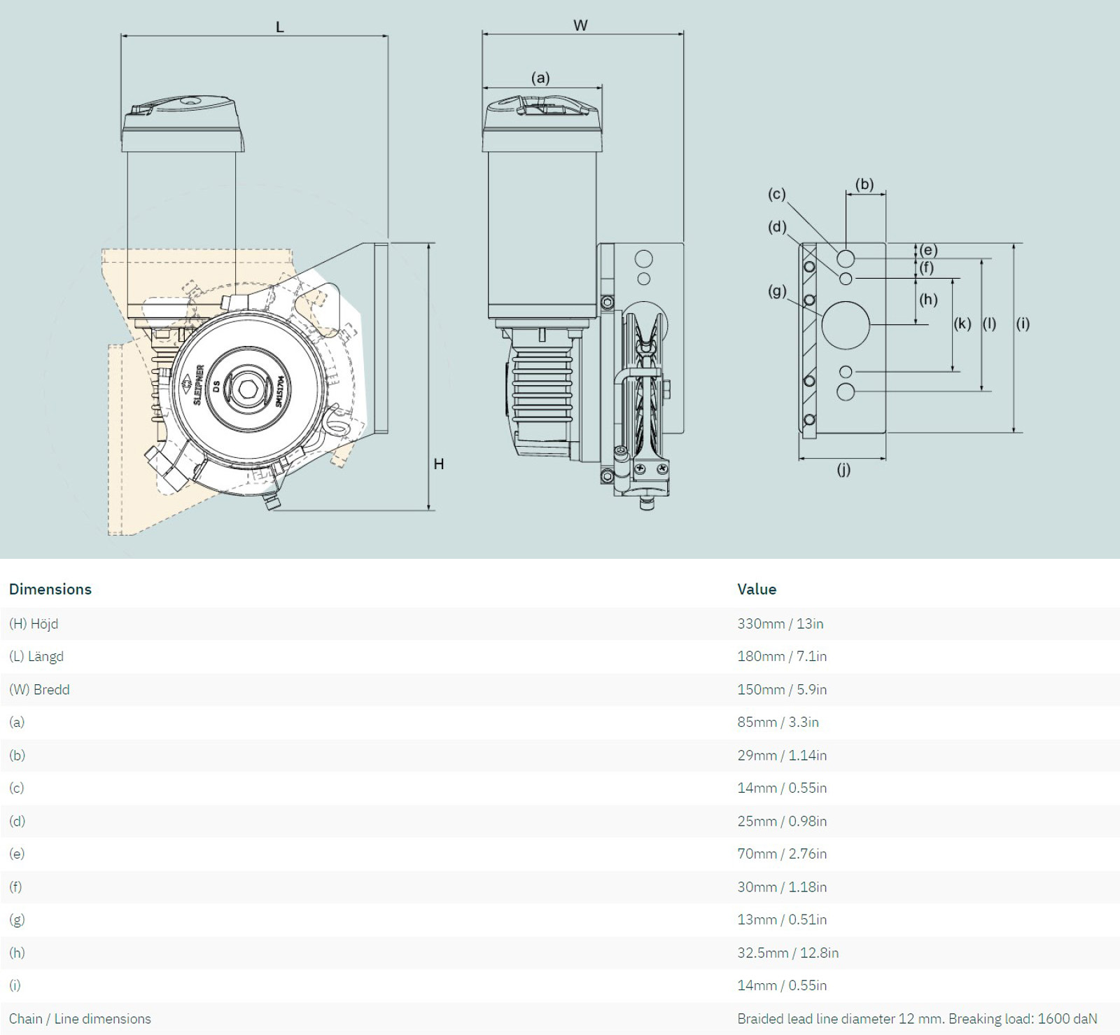 Klarar en ankarvikt på upp till 15kg. Dragkraft 200kg med en draghastighet på ca 20m/min.