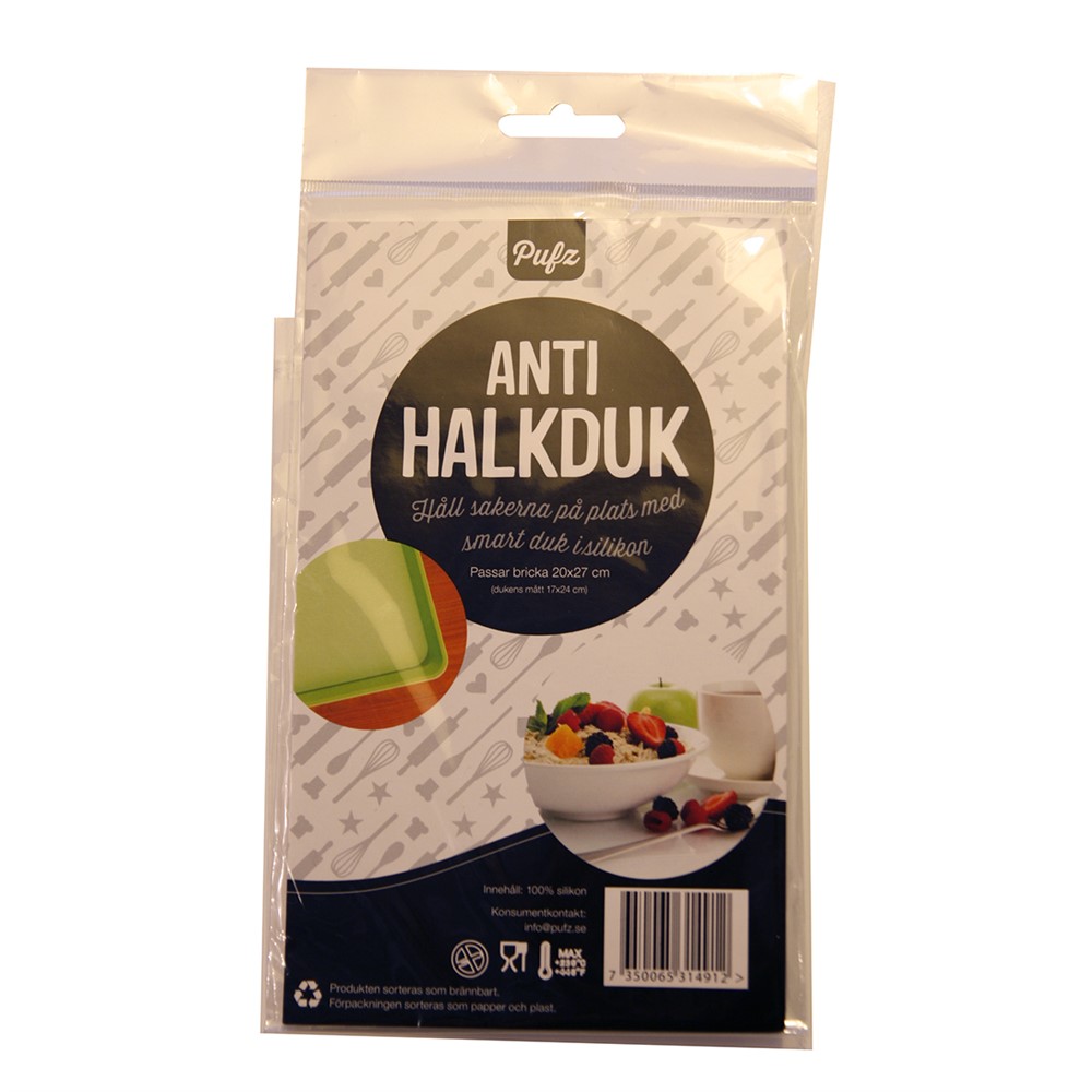 Halkduken finns i två olika storlekar och är enkel att rengöra i diskmaskin eller torka av med en trasa. Den transparenta antihalkduken i silikon fungerar riktigt bra som antiglidunderlägg. Med den kan du känna dig säker att allting står stadigt på bordet.Specifikationer
