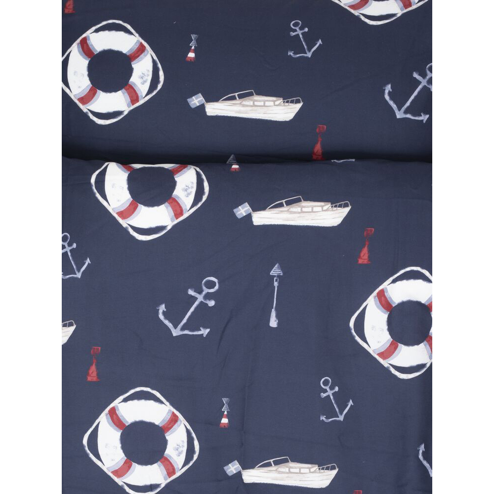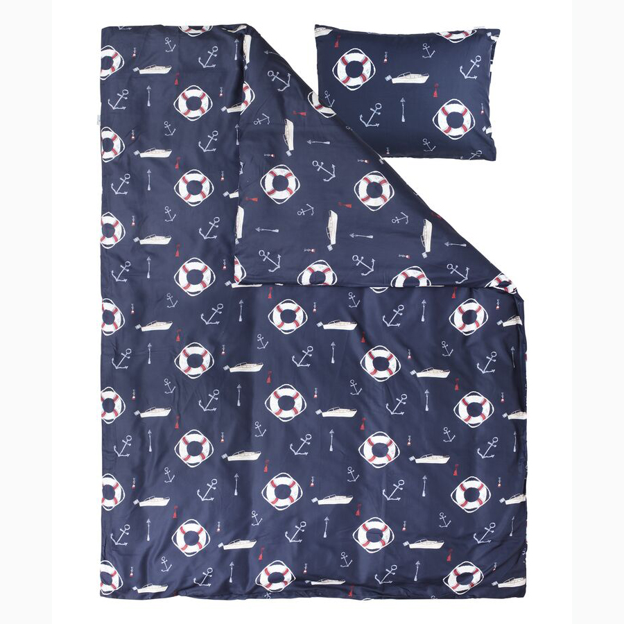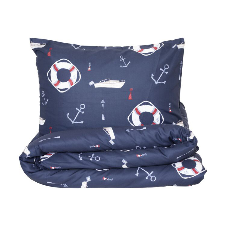 Bäddset i snabbtorkande mikrofiber med skärgårdsmotiv föreställande bojar, ankare, båtar och sjömärken i vitt och rött på marinblå botten.