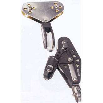 Övre plattan är gjord i rostfritt stål med trissor i mässing för wire och konventionellt enkelblock med hundsfott för lina. Nedre blocket är av fioltyp med råtta för låsning av lina. Lina säljs separat.