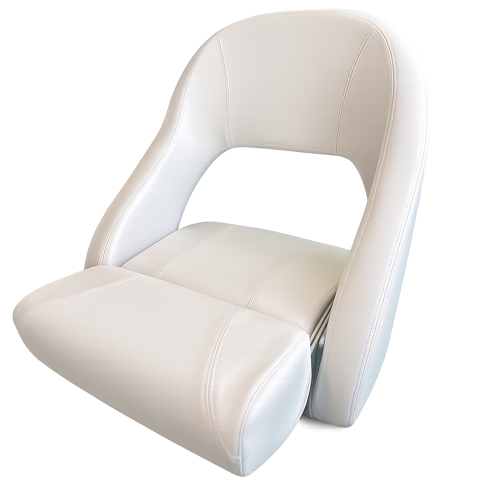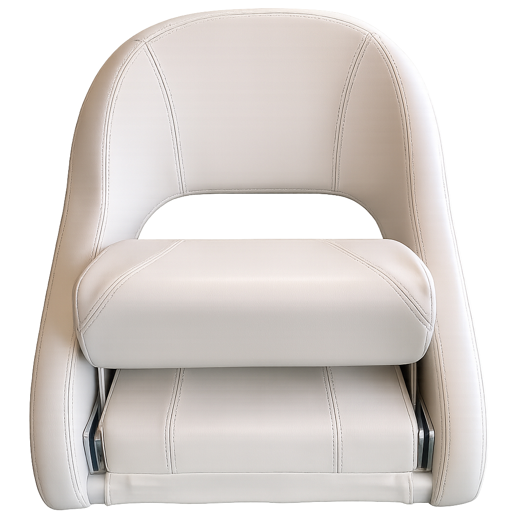 Modern och sportig båtstol med smart kombinerad stå- och sittfunktion. Den uppfällbara frontdynan är konstruerad med parallella gångjärn som ger rätt avlastning och ergonomiskt stöd – oavsett om du sitter bekvämt under längre turer eller står upp vid aktiv körning.