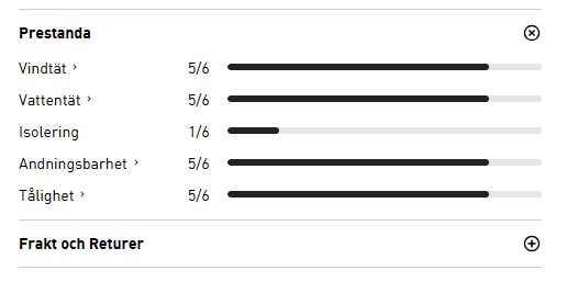 Använd inte biologiskt tvättmedel. Använd tvättmedel avsett för tekniska plagg. Stäng kardborrebanden före tvätt. Stäng dragkedjorna före tvätt. Stryk inte på tryck. Låt inte plagget ligga i blöt. Använd inte sköljmedel. Ta ut plagget ur tvättmaskinen direkt efter tvätt. Viss blekning kan förekomma på starka färger. Torktumla plagget för att återaktivera den vattenavvisande behandlingen. Tvätta mörka färger separat.Specifikationer