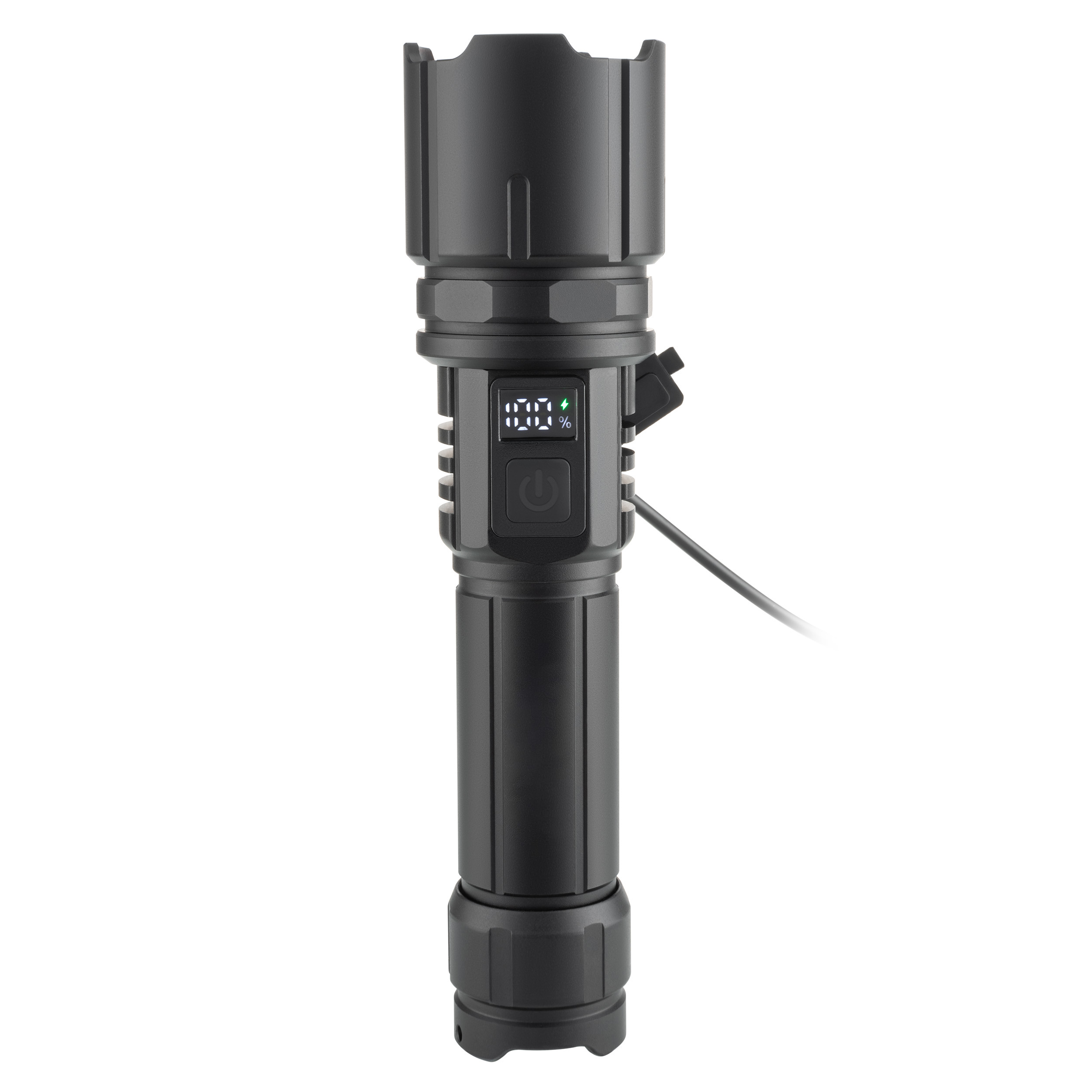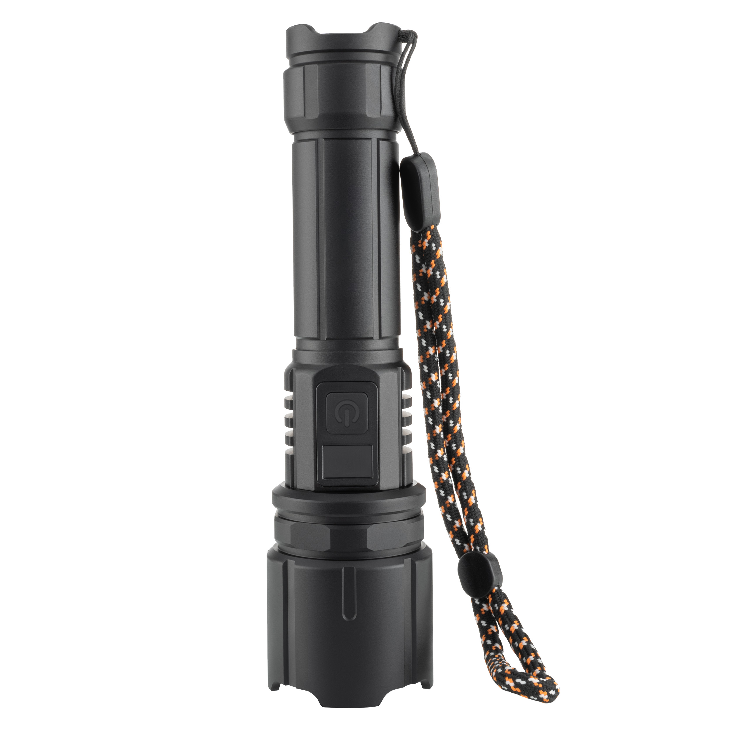 Robust LED-ficklampa med ställbart sken. Levereras med handlovsrem och USB-C laddkabel. Ficklampan kan även användas som powerbank. Svart aluminium.
