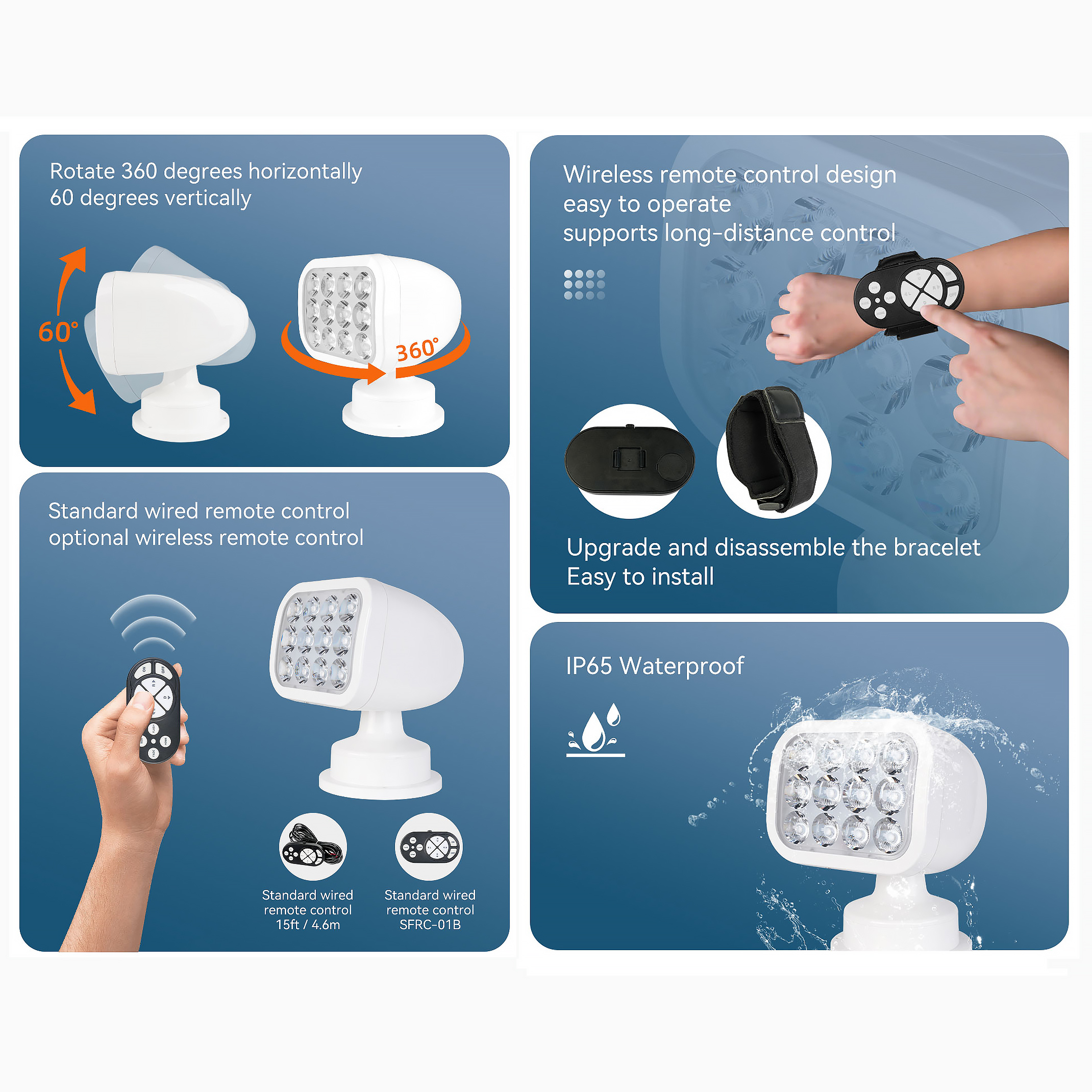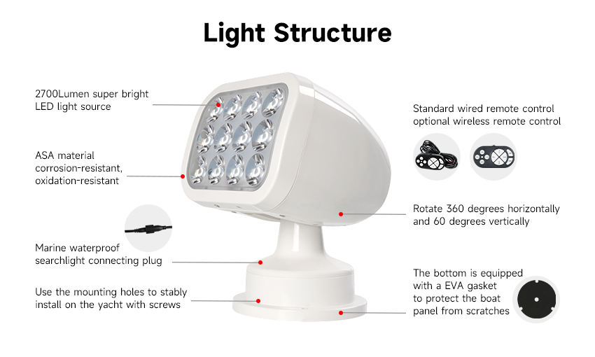 SEAFLO LED-fjärrstrålkastare är en rundstrålande, multivinkel och långdistansstrålkastare. M. a. o. kan den rotera 360 grader horisontellt och 60 grader vertikalt samt når ljuskäglan ca 300-400m. Utrustad med fjärrkontroll och multifunktionsinställningar för användarvänlighet. Perfekt för sjömän som lokaliserar bojar, förtöjningsplatser, kanalmarkeringar etc. Funkar även till, husbilar och bussar för att lokalisera vägskyltar, campingplatser eller som backljus.