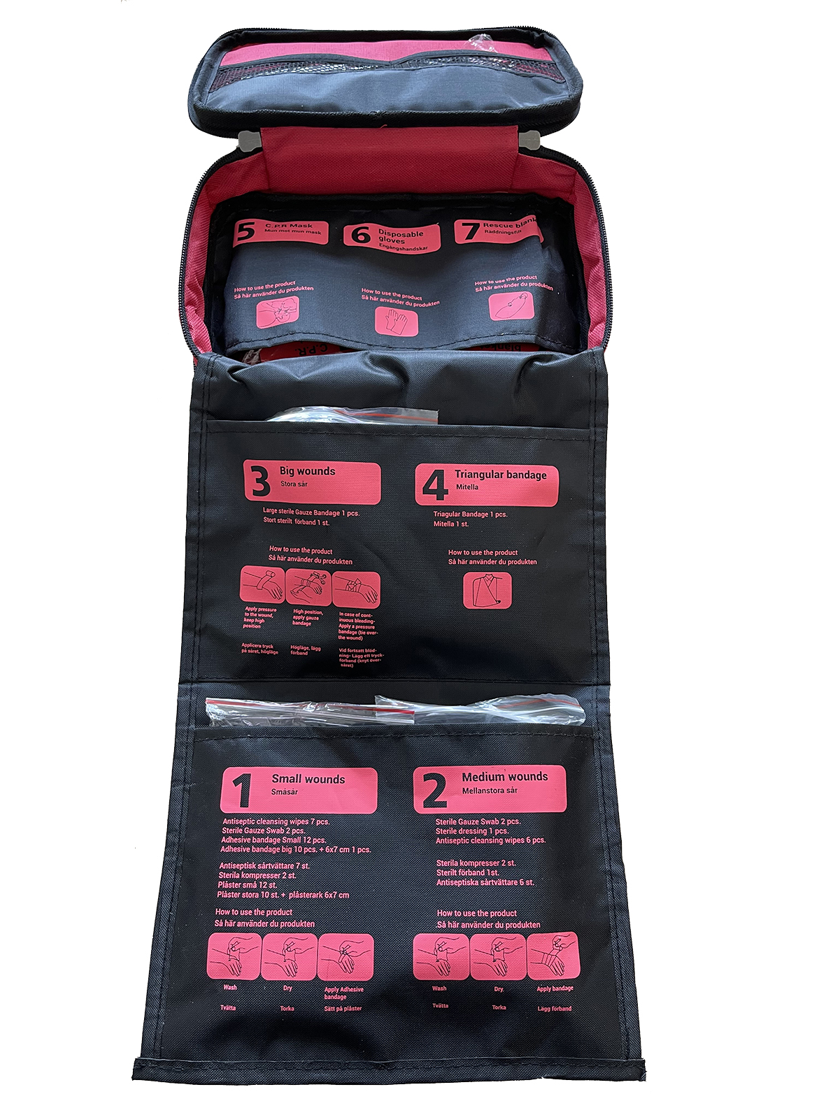 Innehåller: Plåster & kompress för behandling av små sår. Förband för behandling av mellanstora och stora sår. Sårtvätt. Sax. Burngel. Pincett. Säkerhetsnålar. Engångshandskar. CPR/ Mun mot mun mask. Mitella. Nödfilt.