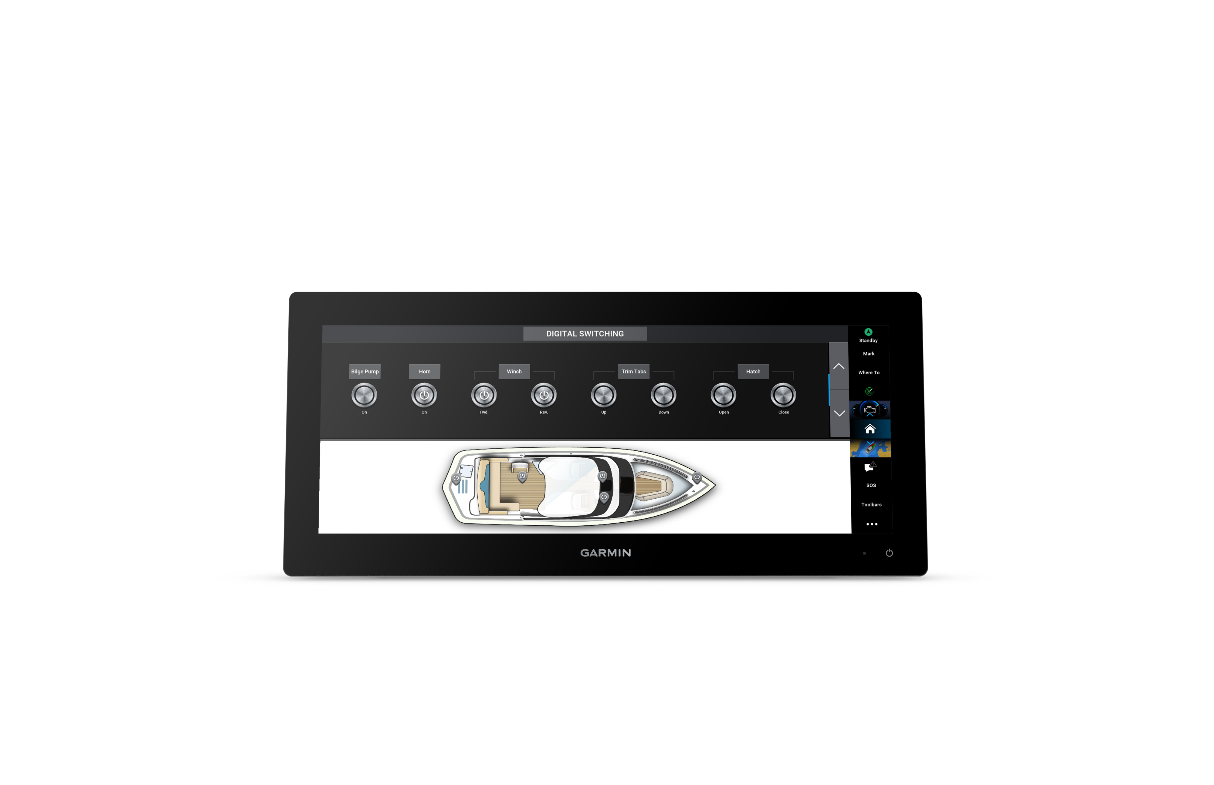 Anslut och styr kompatibla enheter från tredje part via digital switching med EmpirBus™ och andra kompatibla produkter med integrerad digital OneHelm™-switching. Den inbyggda Wi-Fi®-funktionen gör det möjligt att enkelt ansluta till den kostnadsfria appen ActiveCaptain® för åtkomst till funktioner som OneChart™, smartaviseringar och programvaruuppdateringar.