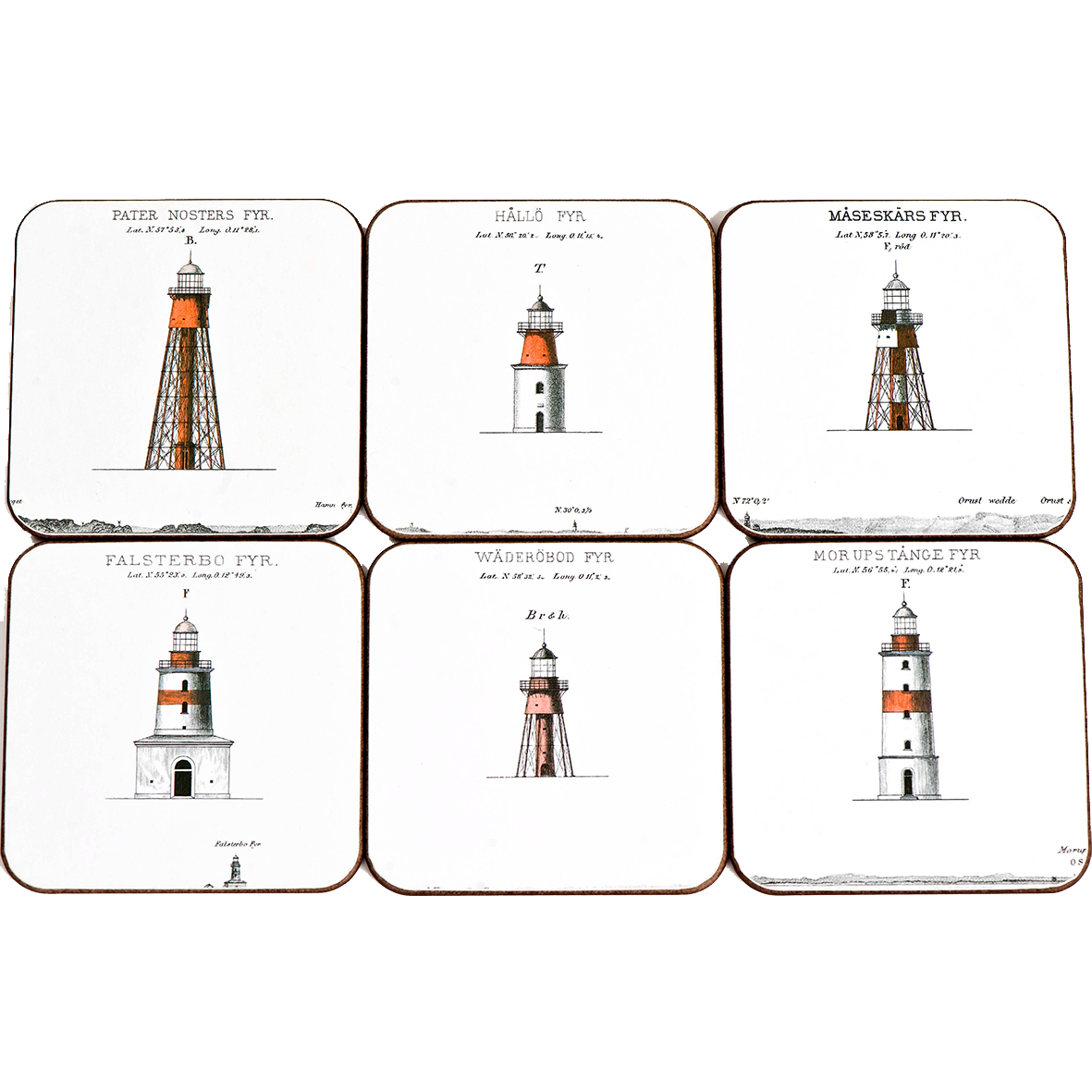 Glasunderlägg med motiv av svenska fyrar på Västkusten. Tillverkade i melamin/mdf/kork.
