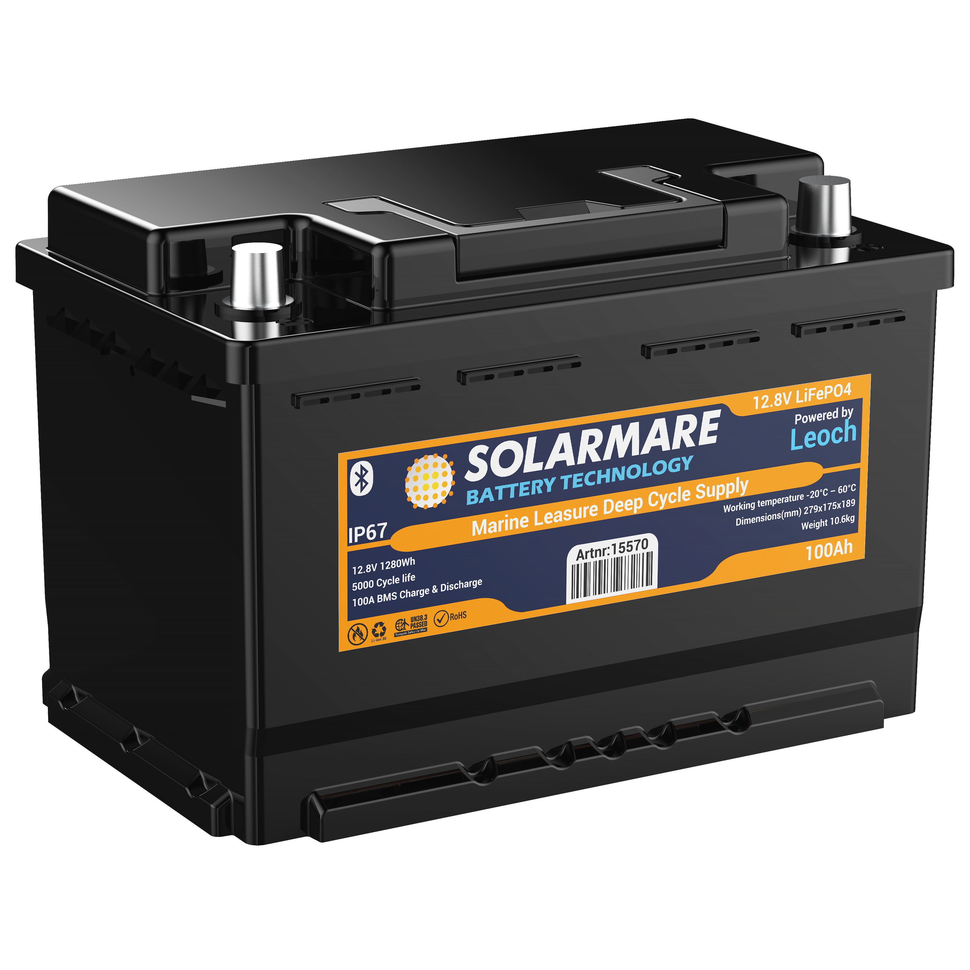 - Solarmare 100Ah är ett 12,8 V LiFePO₄-batteri utvecklat för krävande applikationer inom marin, fritid och energilagring. Tack vare integrerad Bluetooth kan du enkelt övervaka batteriets status i realtid – direkt i mobilen.