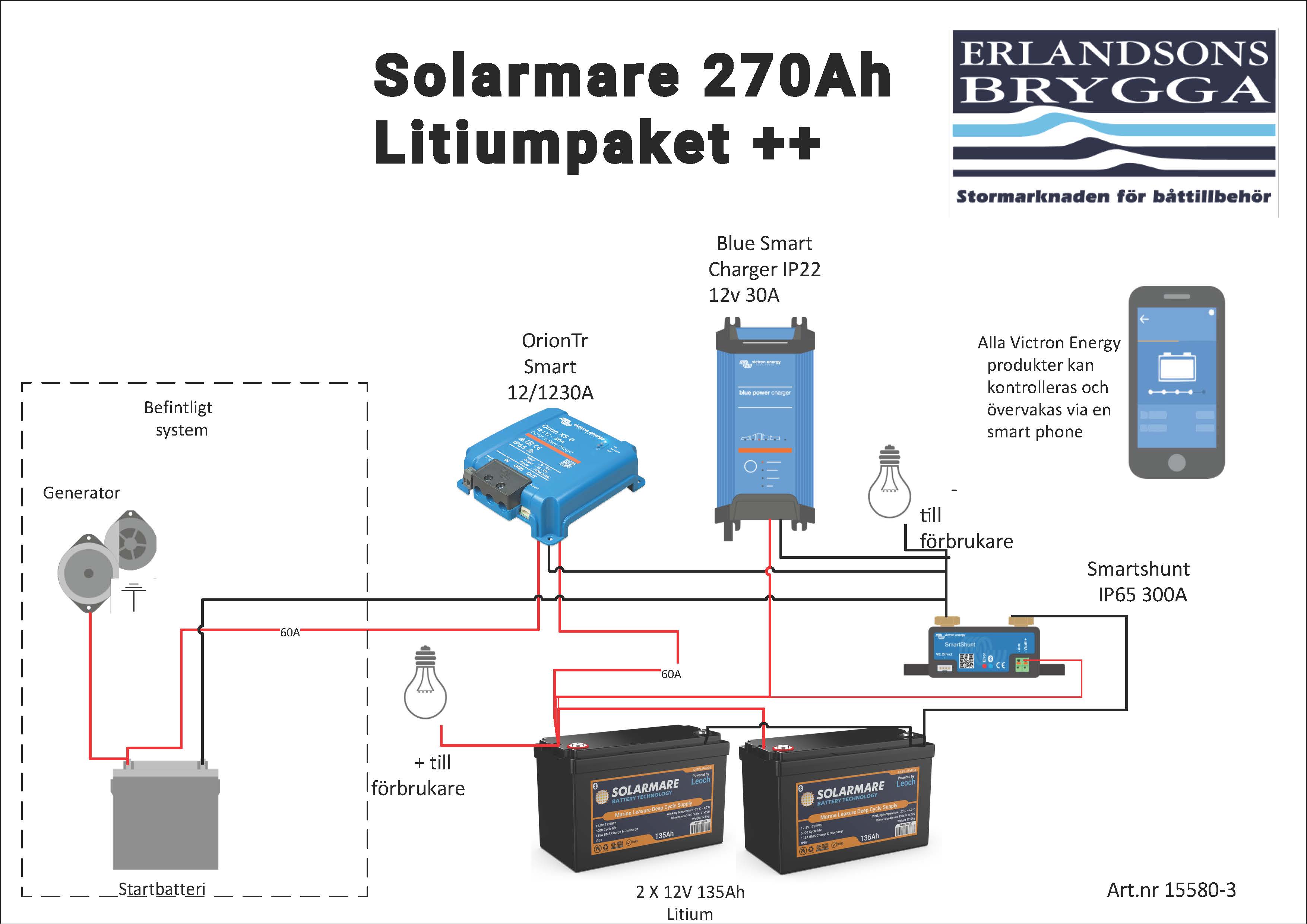 Solarmare-batteriet har en integrerad, välutvecklad BMS som är byggd för att hantera dina höga krav och skydda vid varierande belastning. Tillsammans med komponenter från välrenommerade Victron får du kontrollerad, korrekt & övervakad laddning till din batteribank. Kombinationen ger en stabil och driftsäker lösning för båtägare som vill uppgradera till litium med trygg funktion över tid.
