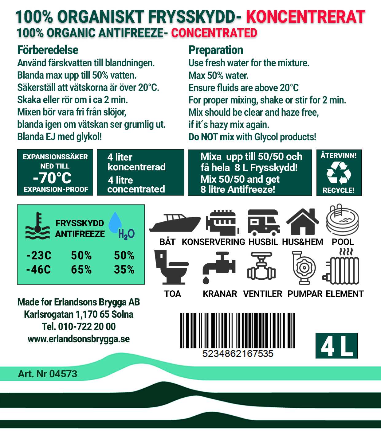 Organiskt Frysskydd antifrostvätska är i första hand avsedd för vinterkonservering. Om du önskar använda den i värmemedium såsom vattenburen värme eller sötvattensdelen i kylare, konsultera först din motortillverkare angående garantivillkor.
