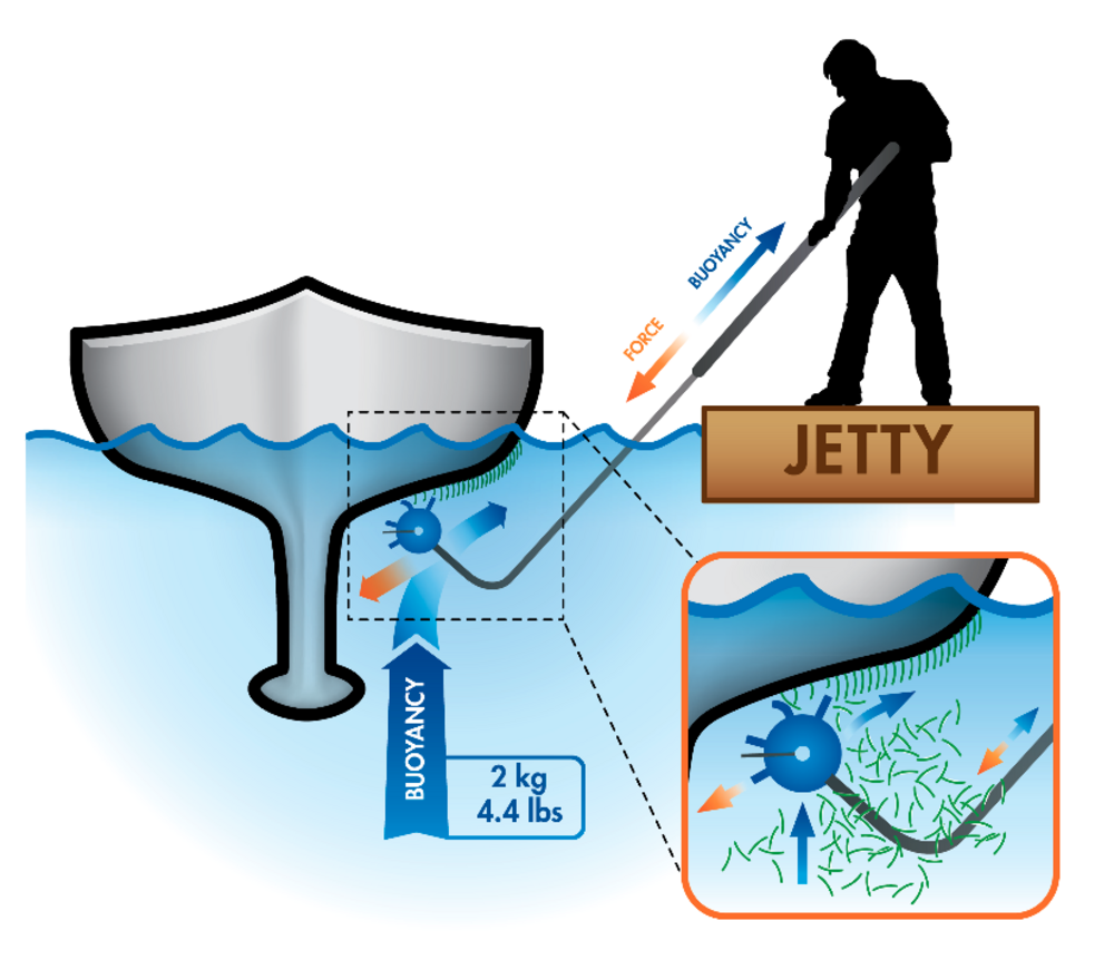 När båten fortfarande befinner sig i vattnet så är det väldigt lätt att skrubba bort beväxningen från båtskrovet innan det gror för att bli havstulpaner och snäckor. Rengöringshuvudet har en inbyggd flytkraft på 2 kg som trycker upp mot skrovet. Materialval, utformning och funktion gör den unik för ändamålet. Skraplisterna är av gummi och när man drar i handtaget fram och tillbaka så skrapar de smala listerna med 2kg tryck mot ditt båtskrov, vilket tar bort beväxning såsom sjögräs och tidiga havstulpaner väldigt effektivt. Även slemmet som bildas på skrovet tas bort.