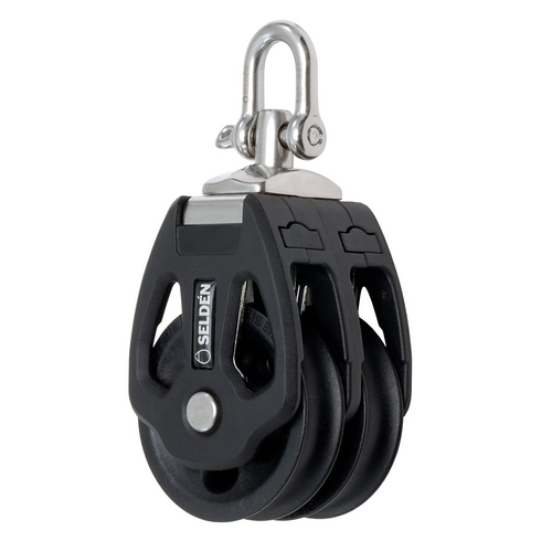 Glidlagrat dubbelblock från Seldén. Glidlagrade block passar perfekt vid hög och statiskt belastning. PBB 50 har acetaltrissa, rostfritt band för bästa styrka och livslängd samt styva glasfiberförstärkta sidor