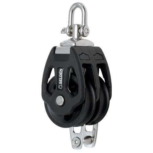Dubbelblock med hundsvott. Glidlagrade block passar perfekt vid hög och statiskt belastning. PBB 60 har acetaltrissa, rostfritt band för bästa styrka och livslängd samt styva glasfiberförstärkta sidor