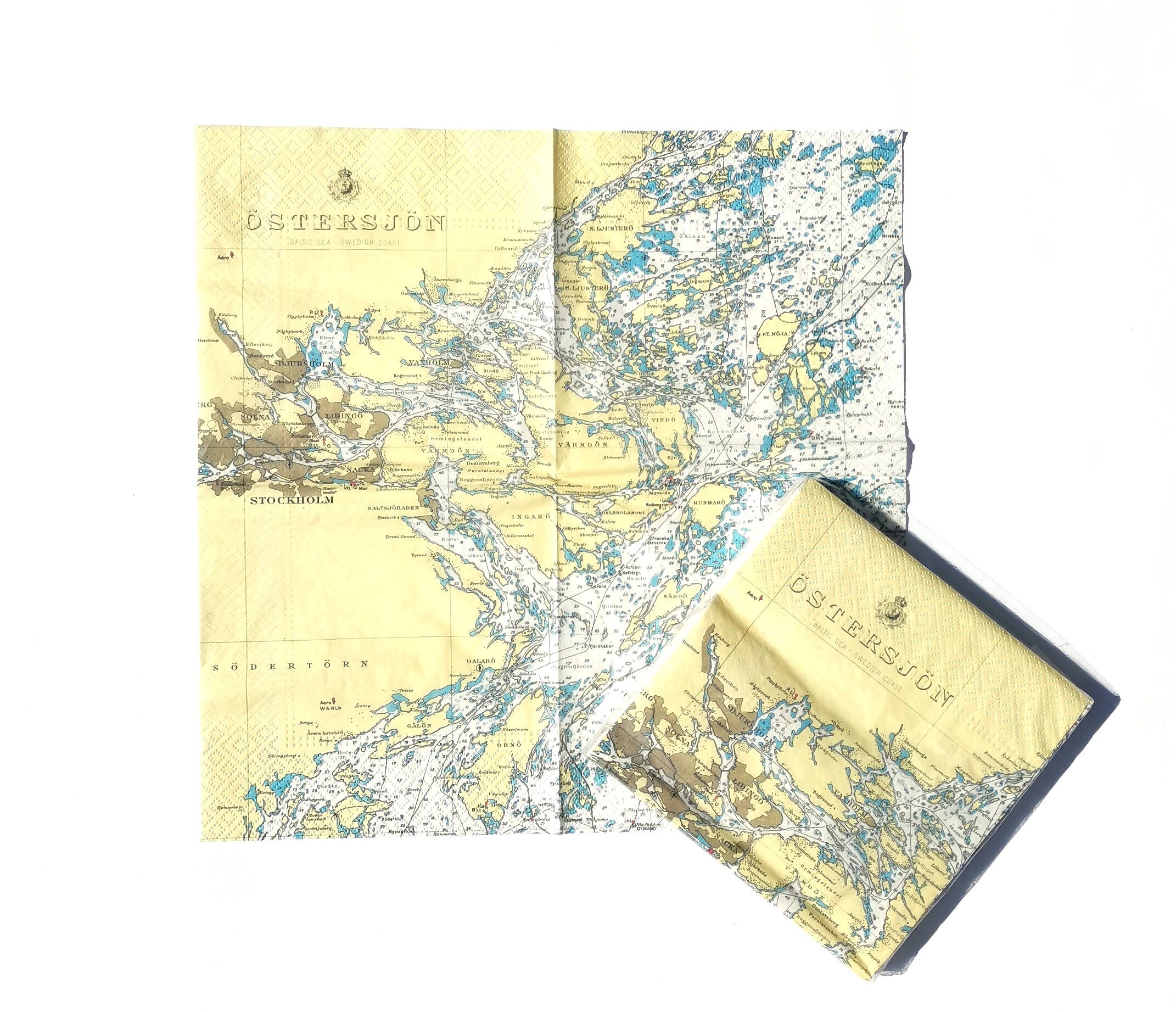Servett med sjökortsmotiv över Stockholms skärgård.