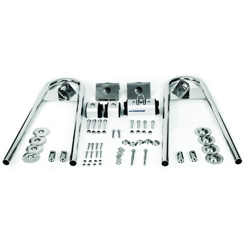 Komplett set med vagn, ändstopp, skena 32 mm (2m), bultar, brickor etc. Konsollerna är justerbara. Krökningsradienskall vara 95% av J-måttet. Standardradie är 3,4 meter.
