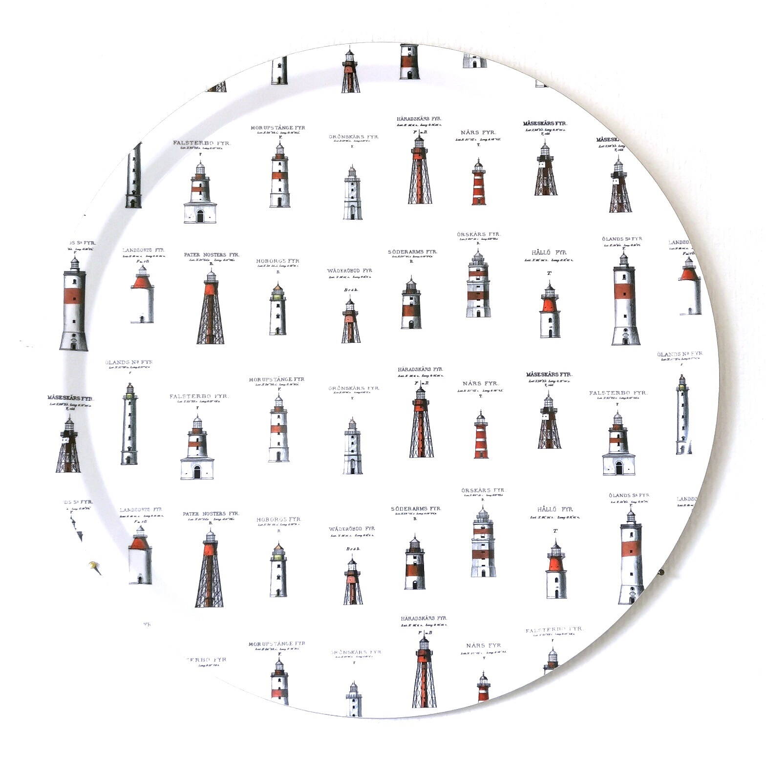 Serveringsbricka med motiv av svenska fyrar. Tillverkad i Sverige av FSC-certifierad björkfanér.