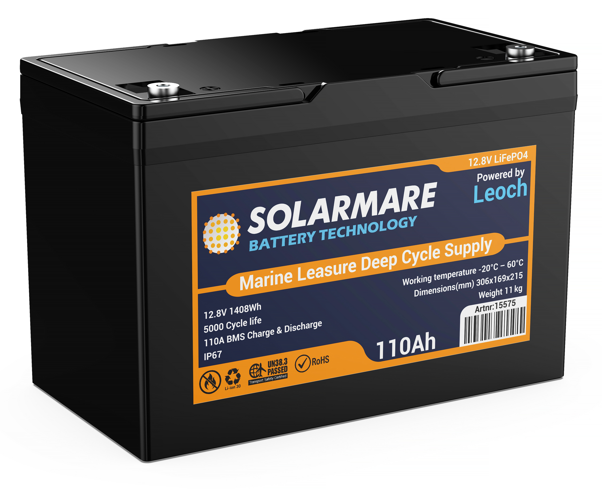 Solarmare 110Ah är ett 12,8 V LiFePO₄-batteri utvecklat för krävande applikationer inom marin, fritid och energilagring.