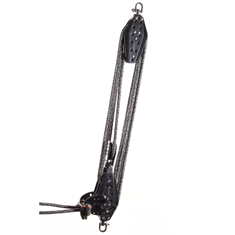 Komplett set med 76 mm spärrblock, polyestertamp, ändlös splits. Diam 10 mm Längd 40 m. Kullagrat med urkopplingsbar spärr. Dra i en lina, 8 ggr utväxling och dra i båda linorna, 4 ggr utväxling.