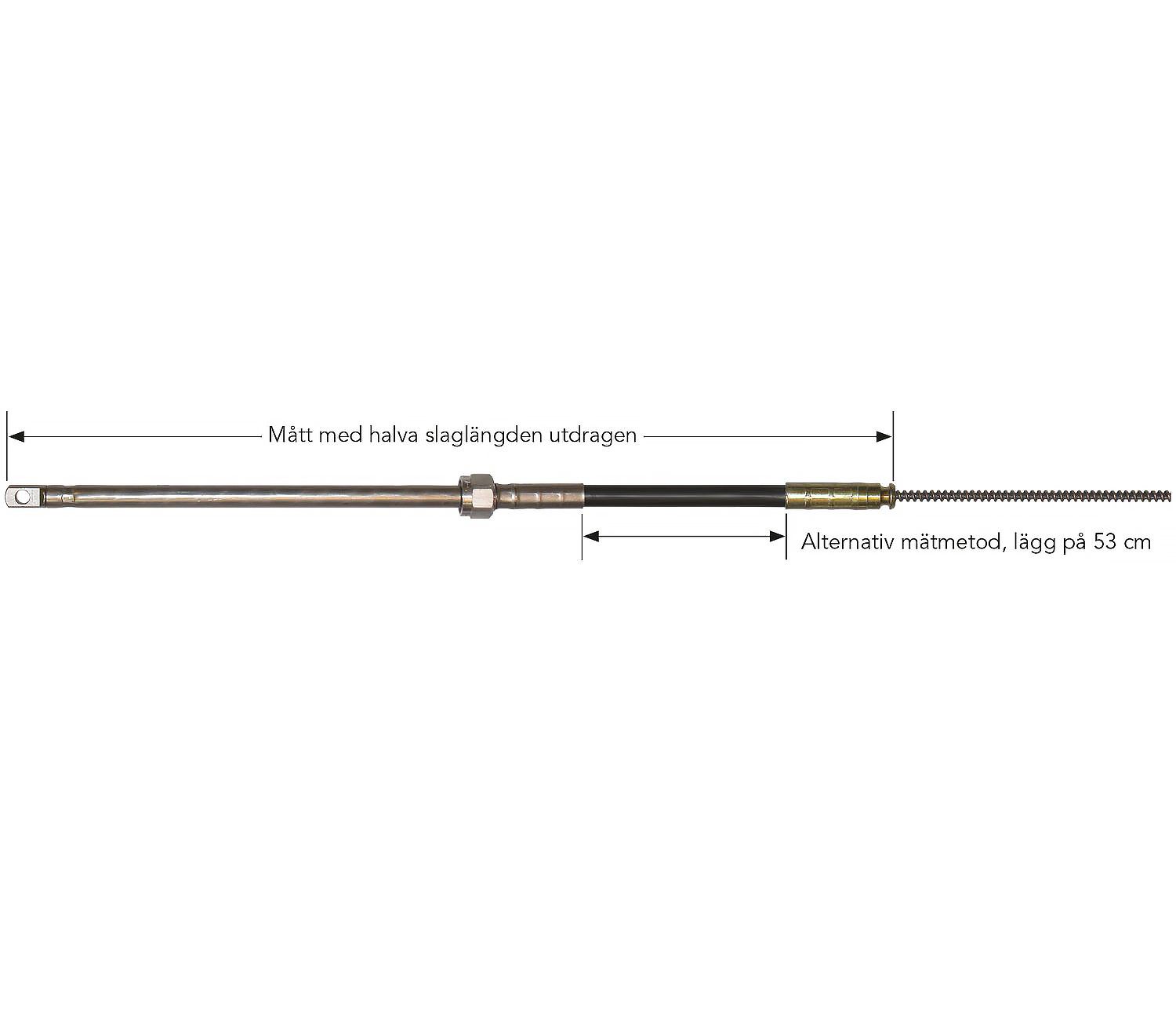 För att få rätt längd på kabeln är det viktigt att mäta rätt. Normalt mäts kabeln från infästningen i styrhuset till änden på kabeln med halva slaglängden utdragen.