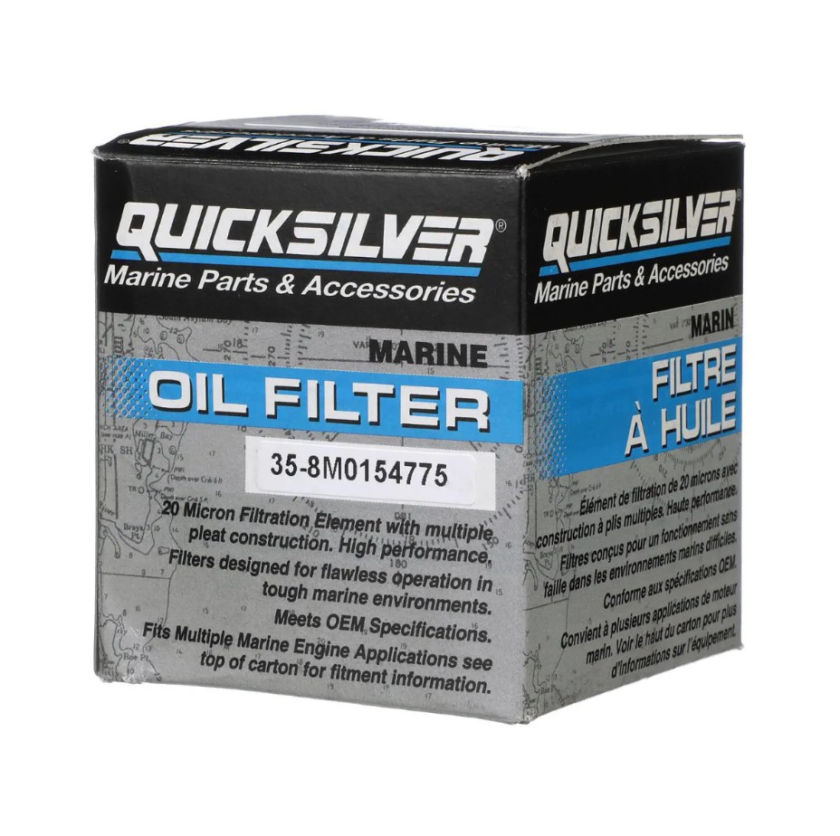 Quicksilver premiumkvalitetsoljefilter, 20-mikron filter-element som ger ett överlägset motorskydd. Filtret uppfyller eller överträffar OEM-tillverkarens specifikationer.