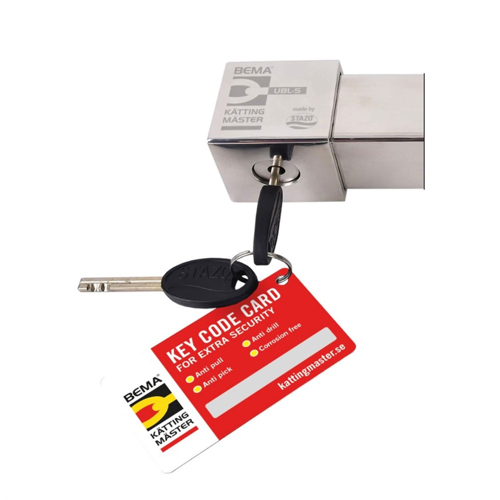 Enkel montering som låser in båda vingmuttrarna. Monteringsanvisning finns på baksidan av förpackningen. Det medföljer 2st nycklar samt ett nyckelkort.