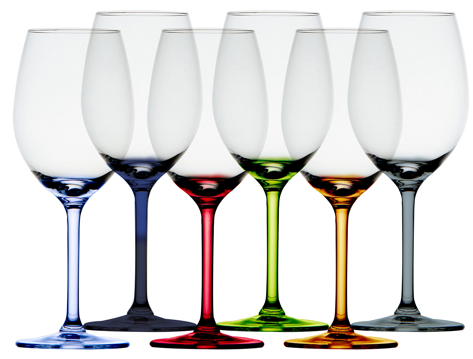 Set med 6 st okrossbara vinglas i olika färger. Tillverkat av Ecozen, ett material som påminner mycket om glas.